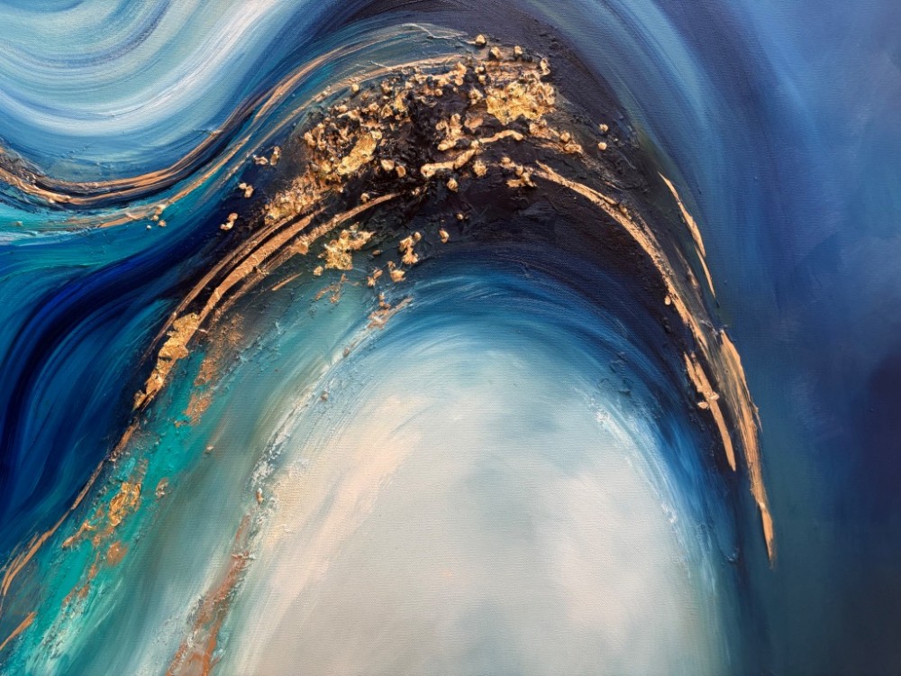 In this piece, I swirled oil and plaster to capture the dynamic essence of movement. The spiraling blues and turbulent strokes express a deep emotional release, like an unstoppable wave freeing itself. Accents of golden leaf infuse the composition with bursts of light and energy, symbolizing hope and resurgence. This artwork brings a powerful and uplifting energy to any space, inviting viewers to dive into their own depths and emerge renewed.